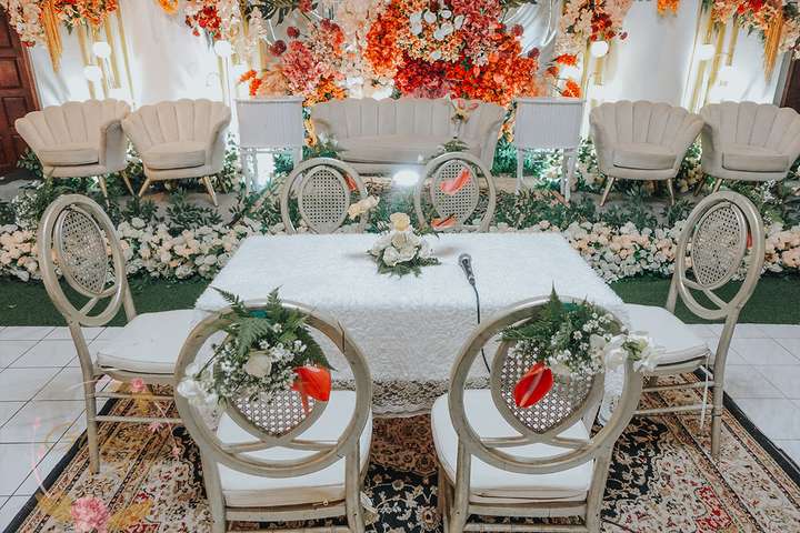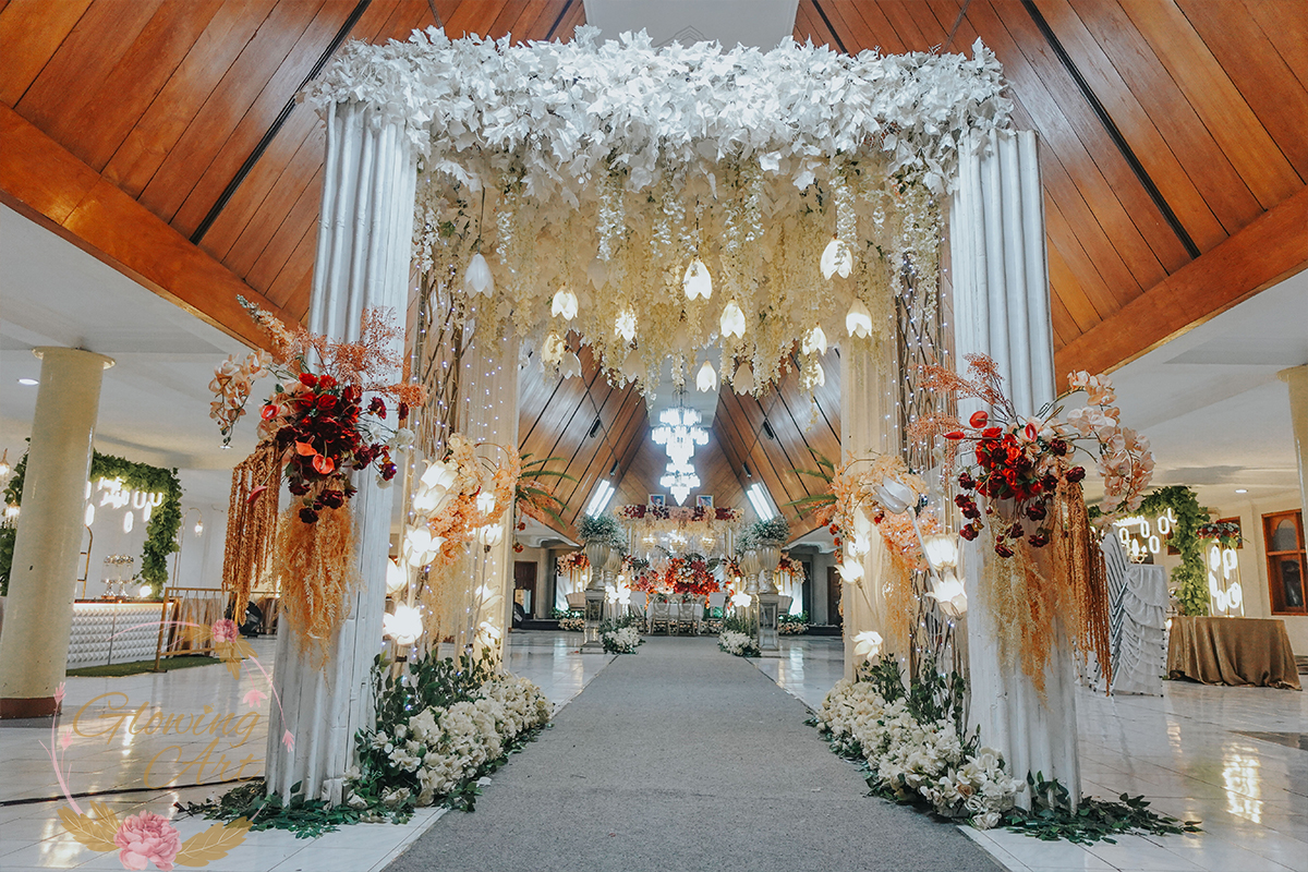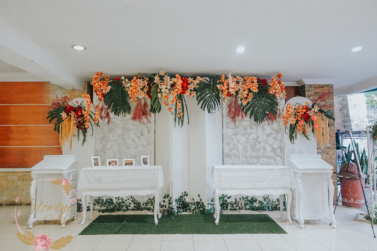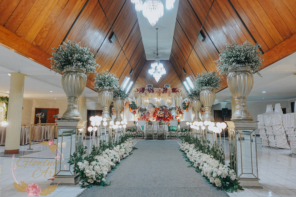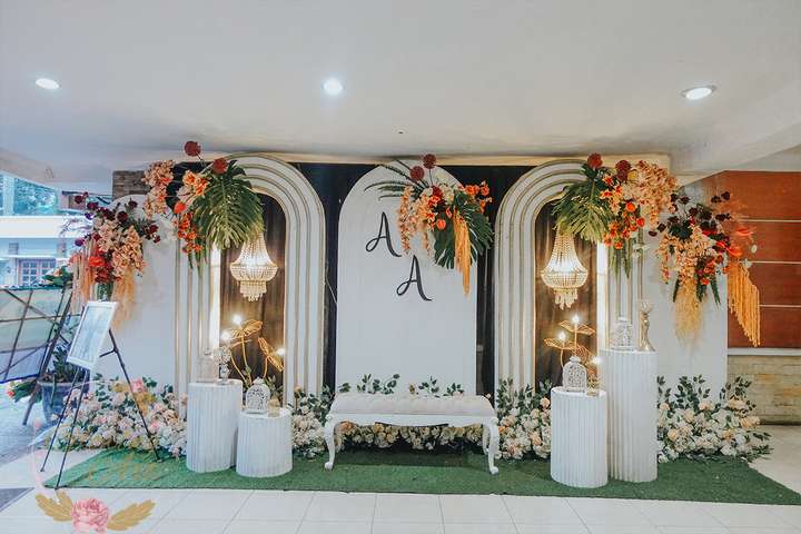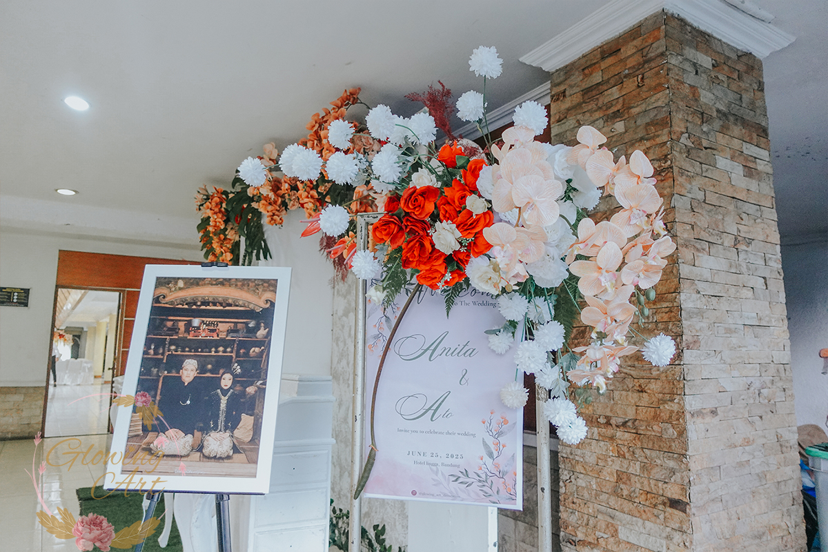 Kak Anita &Kak Ato Dekorasi oleh Glowing Art Decoration kali ini dilaksanakan di Hotel Lingga Bandung. Pasangan yang melaksanakan Pernikahan adalah Kak Anita &Kak Ato. Acara dilaksanakan pada tanggal 25 Juni 2025. Dekorasi kali ini sangat spesial karena dibuat untuk acara yang luar biasa spesial di hari pernikahan antara Kak Anita &Kak Ato. Glowing Art Decoration menampilkan karya terbaik untuk pelaminan yang memiliki aksen Modern – Elegan – Simple dengan nuansa warna terdiri dari Putih, orange, coklat dan peach menjadi dominan dalam acara pernikahan ini. Pada dekorasi acara pernikahan ini, Glowing Art Decoration memasang dekorasi yang terdiri dari area photobooth, Stand flower 6 pcs, standar jalan, set area akad, penerima tamu dengan kotak angpau,area aisle dengan pergola dan area sisi terdapat bunga dengan Pelaminan sampai 8 meter. Glowing Art Decoration juga memberikan Welcome sign khusus untuk acara ini.