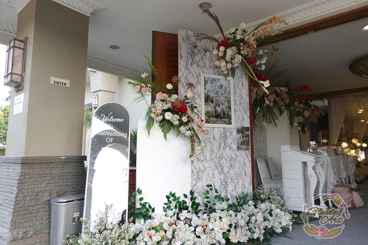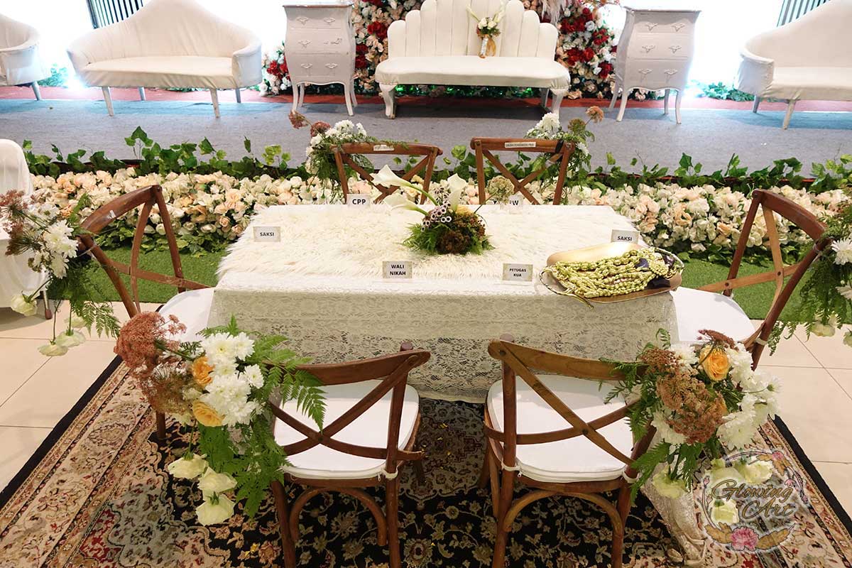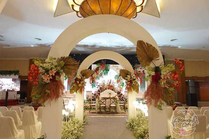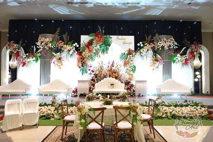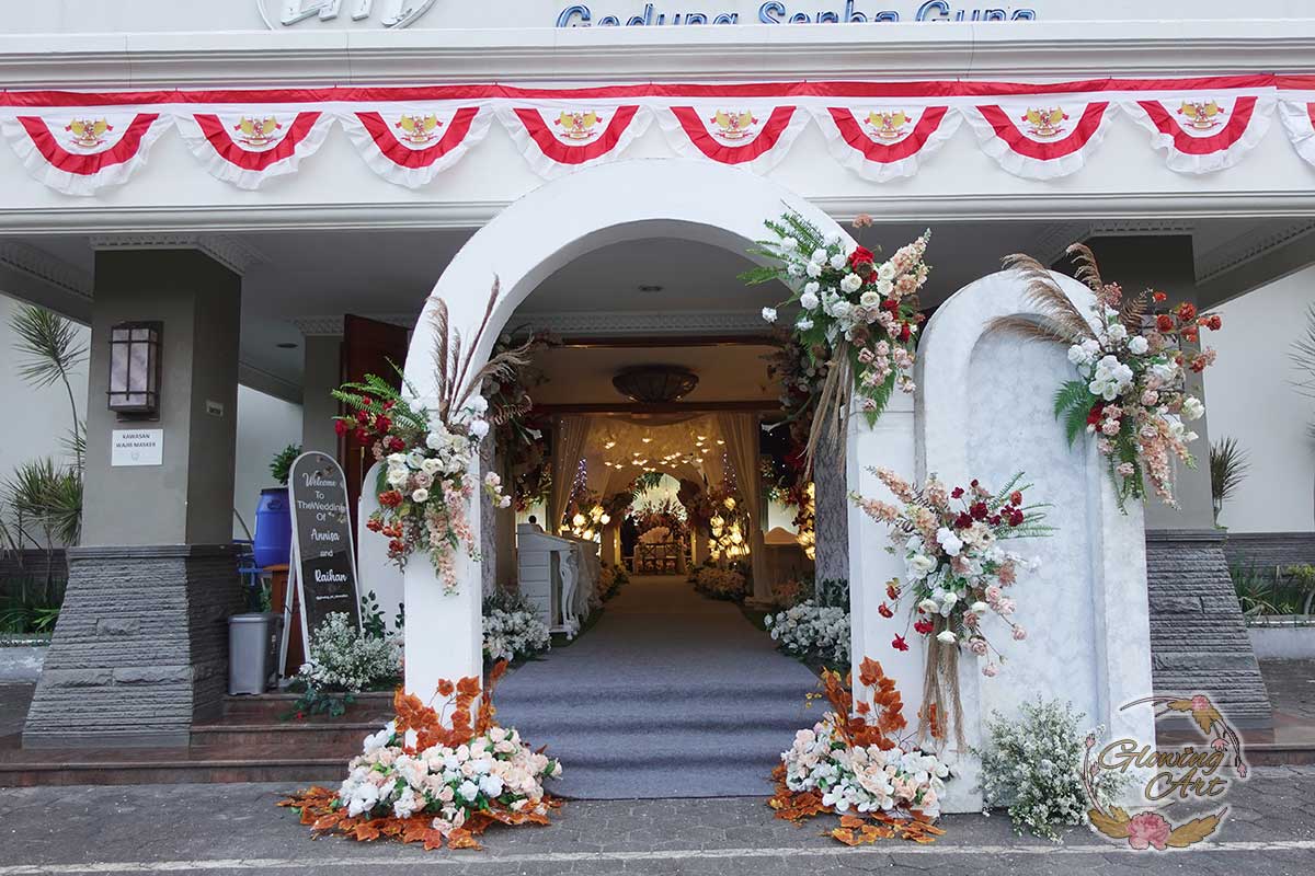 Glowing Art Decoration kali ini dilaksanakan di istana Muara Bandung. Pasangan yang melaksanakan Pernikahan adalah Kak Raihan &Kak Annisa. Acara dilaksanakan pada tanggal 11 Agustus 2024. Dekorasi kali ini sangat spesial karena dibuat untuk acara yang luar biasa spesial di hari pernikahan antara Kak Raihan &Kak Annisa. Glowing Art Decoration menampilkan karya terbaik untuk pelaminan yang memiliki aksen Modern – Elegan – Simple dengan nuansa warna terdiri dari orange,maroon, merah,peach,dan mahogany menjadi dominan dalam acara pernikahan ini. Pada dekorasi acara pernikahan ini, Glowing Art Decoration memasang dekorasi yang terdiri dari area 1 set photobooth, 1 set Photogallery, Gate jalan, Stand flower 6 pcs, standar jalan dengan pergola dan gate Aisle, set area akad, penerima tamu dengan kotak angpau, area sisi terdapat bunga dan Pelaminan sampai 10 meter. Glowing Art Decoration juga memberikan Welcome sign khusus untuk acara ini.