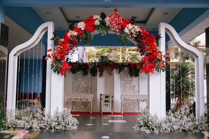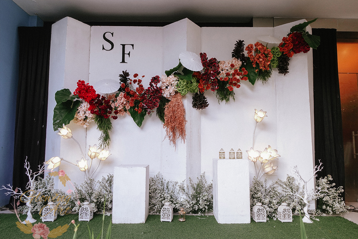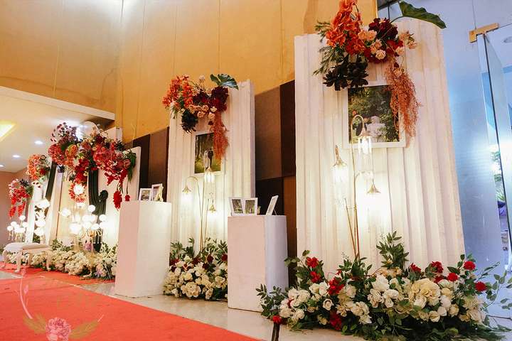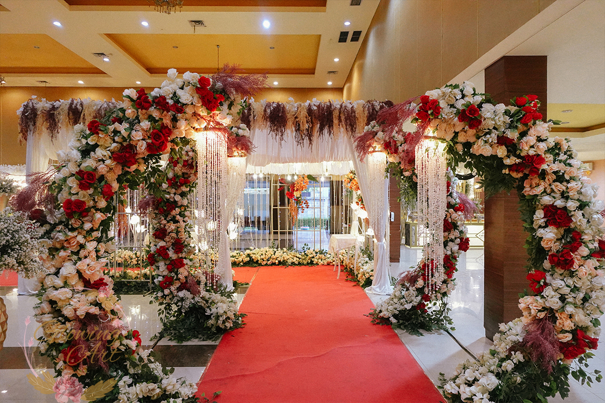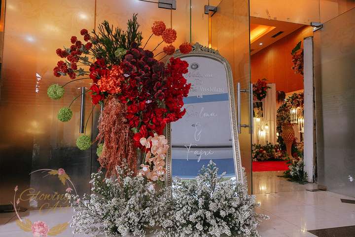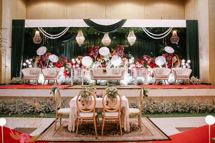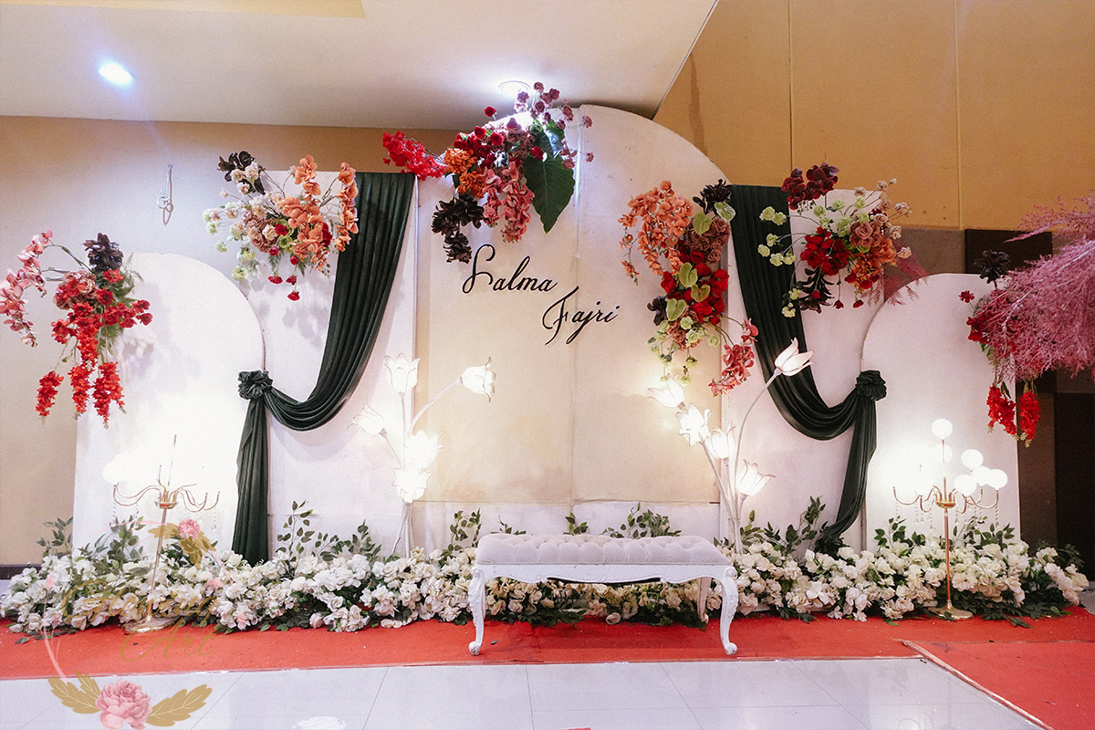 Kak Salma &Kak Fajri Dekorasi oleh Glowing Art Decoration kali ini dilaksanakan di GD Indah Karya Bandung. Pasangan yang melaksanakan Pernikahan adalah Kak Salma &Kak Fajri. Acara dilaksanakan pada tanggal 04 Oktober 2025. Dekorasi kali ini sangat spesial karena dibuat untuk acara yang luar biasa spesial di hari pernikahan antara Kak Salma &Kak Fajri. Glowing Art Decoration menampilkan karya terbaik untuk pelaminan yang memiliki aksen Modern – Elegan – Simple dengan nuansa warna terdiri dari merah, maroon, hijau emerald, mahogany menjadi dominan dalam acara pernikahan ini. Pada dekorasi acara pernikahan ini, Glowing Art Decoration memasang dekorasi yang terdiri dari area 2 set photobooth, 2 set Photogallery, 2 set Gate jalan, Stand flower 6 pcs, standar jalan dengan pergola, set area akad, penerima tamu 2 sisi dengan kotak angpau, area sisi terdapat bunga dan Pelaminan sampai 12 meter. Glowing Art Decoration juga memberikan Welcome sign khusus untuk acara ini.