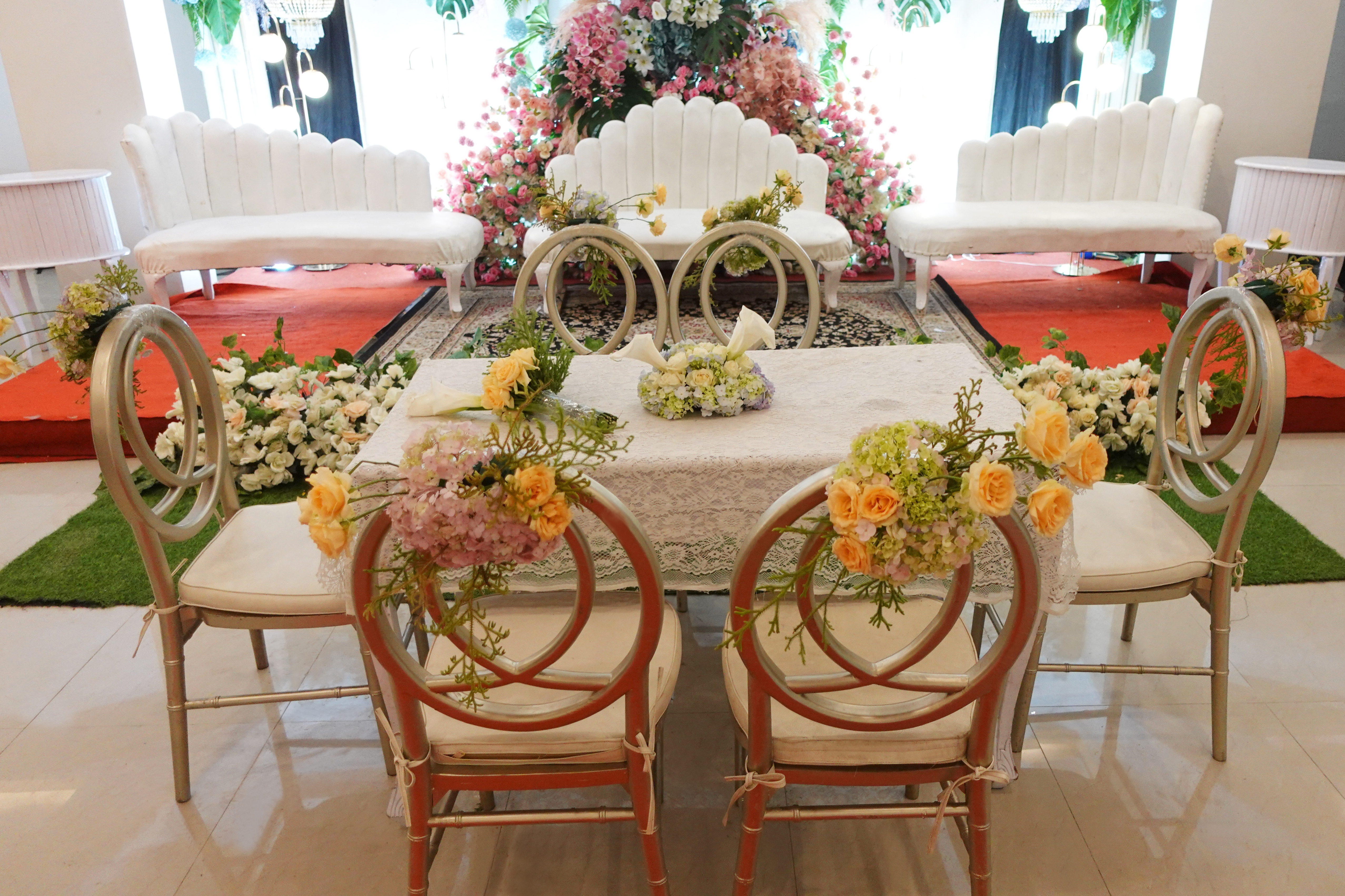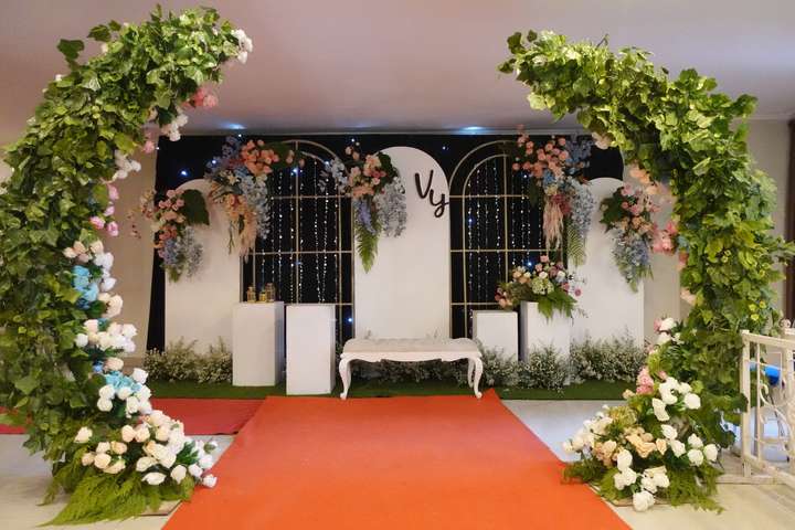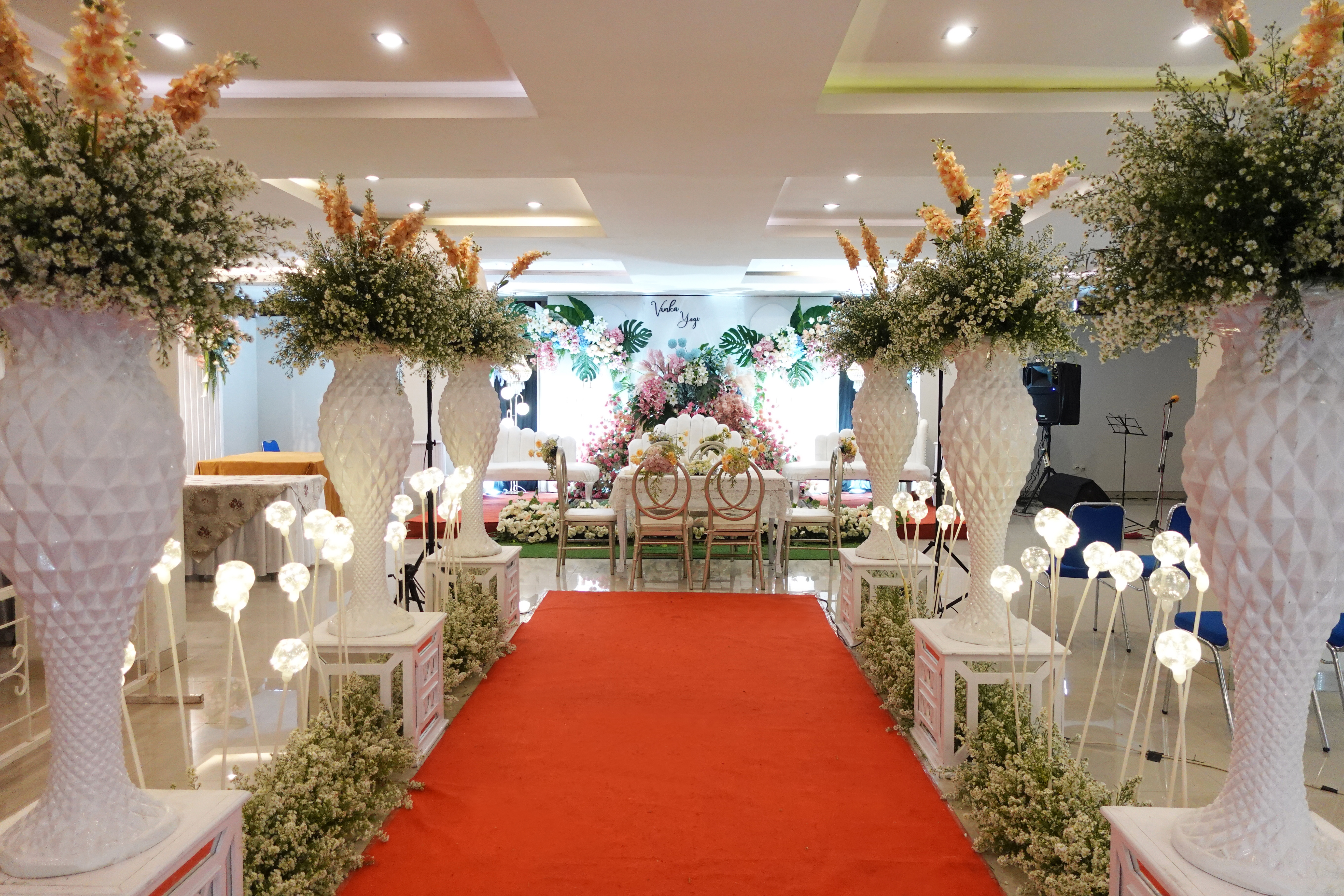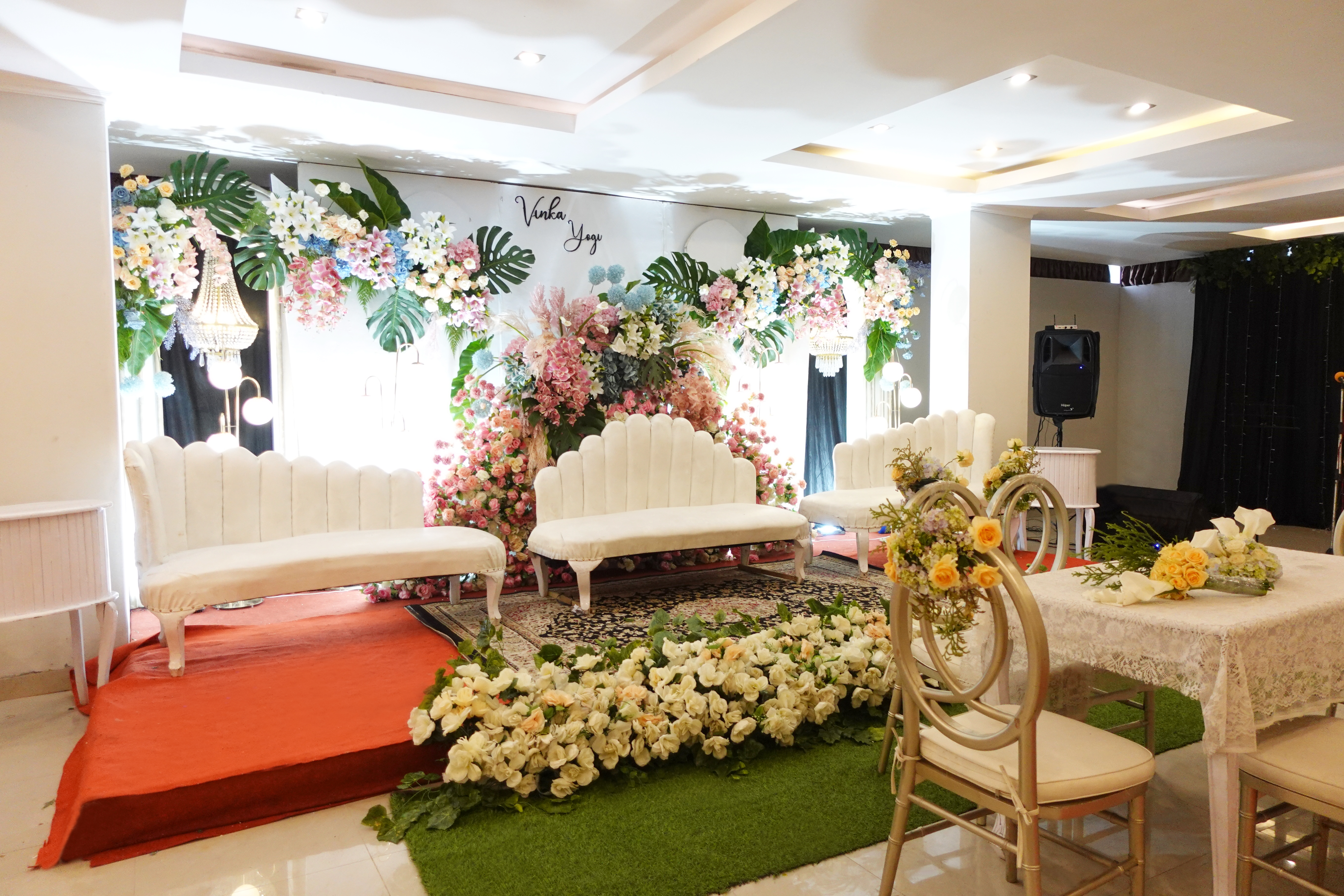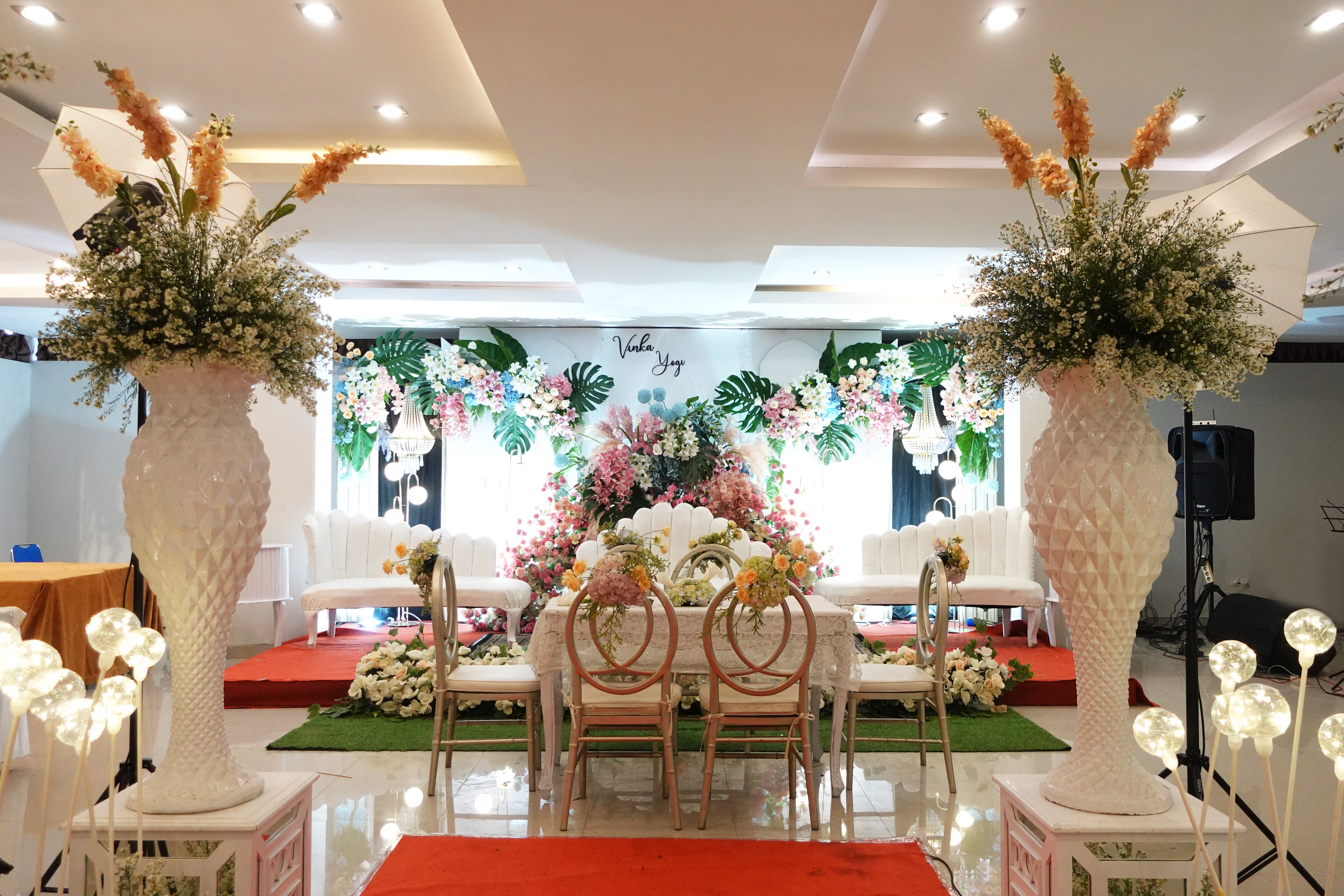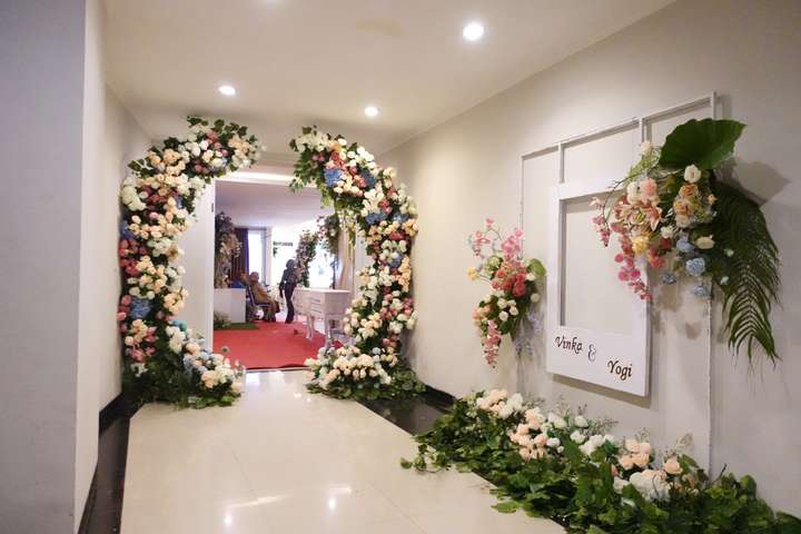 Glowing Art Decoration kali ini dilaksanakan di Raffleshom Hotel Bandung. Pasangan yang melaksanakan Pernikahan adalah Kak Vinka &kak Yogi acara dilaksanakan pada tanggal 07 Januari 2024. Dekorasi kali ini sangat spesial karena dibuat untuk acara yang luar biasa spesial di hari pernikahan antara Kak Vinka &kak Yogi. Glowing Art Decoration menampilkan karya terbaik untuk pelaminan yang memiliki aksen Modern – Elegan – Simple dengan nuansa warna terdiri dari Putih, Baby pink, hijau, dan peach menjadi dominan dalam acara pernikahan ini. Pada dekorasi acara pernikahan ini, Glowing Art Decoration memasang dekorasi yang terdiri dari penerima tamu, 1 set backdrop photobooth, gate bunga jalan 2 pasang, standing flower 6 pcs, dan pelaminan 6m.Glowing Art Decoration juga memberikan Welcome sign khusus untuk acara ini.